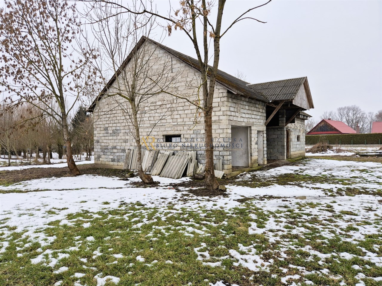 Na działce stoi także budynek gospodarczy o pow. ok. 120 m² z pustaka, kryty również eternitem. Może pełnić role garażu, warsztatu, magazynu, stajni lub pomieszczeń gospodarczych.